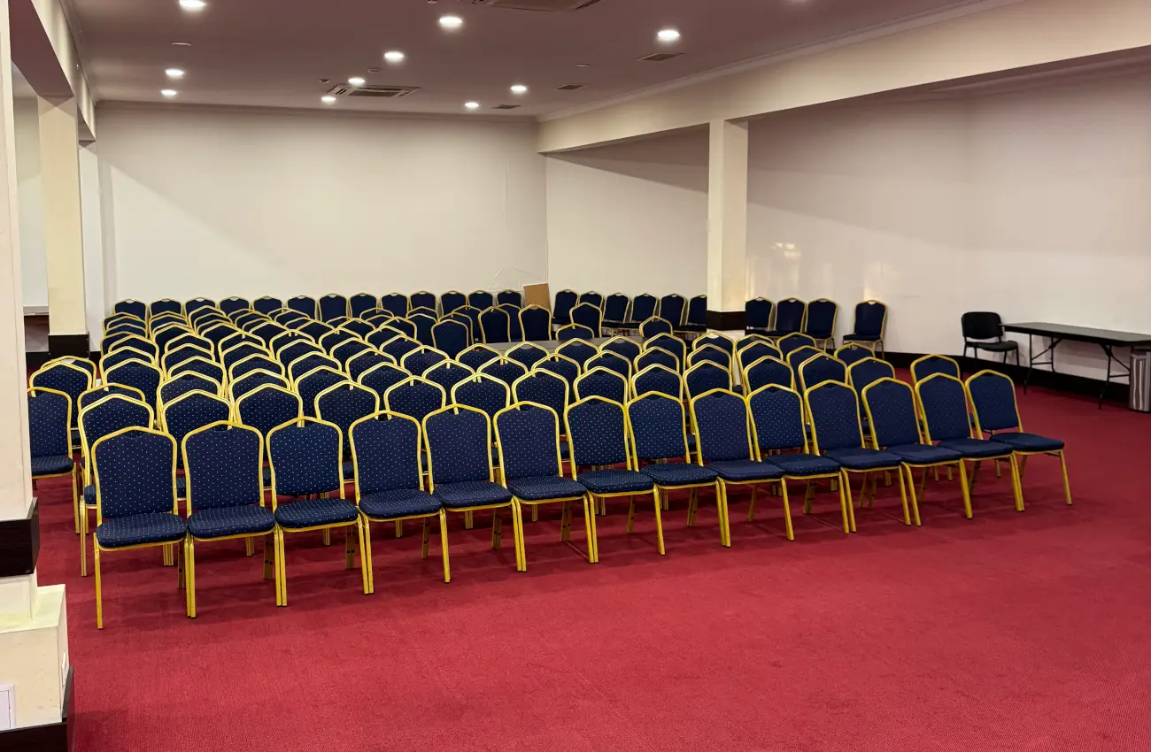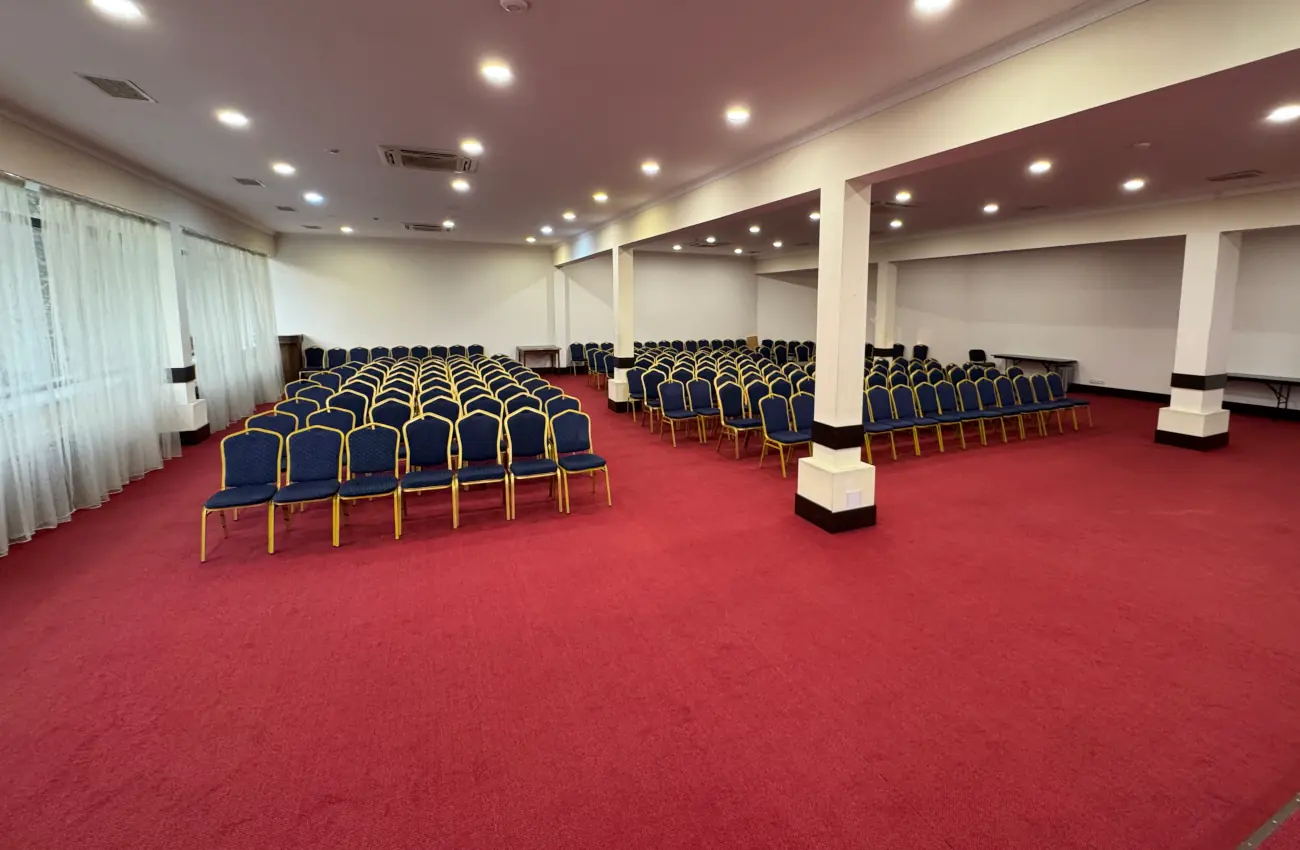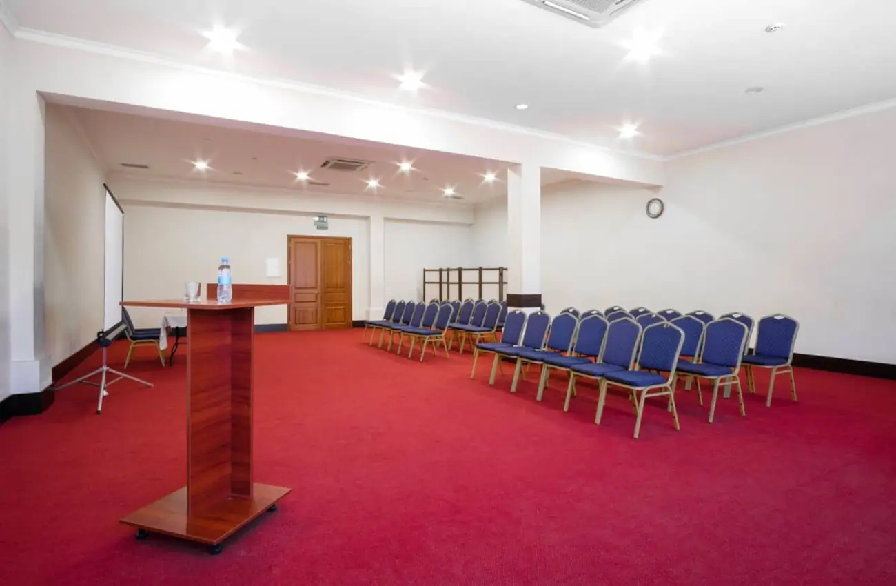 Просторий конференц-зал, що підходить для проведення масштабних заходів, семінарів та презентацій. Оснащений усім необхідним: проектор, акустична система, мікрофон, фліпчарт та інше обладнання для комфортної роботи. Зручне планування та можливість різних форматів розсадки роблять зал універсальним для подій будь-якого рівня.