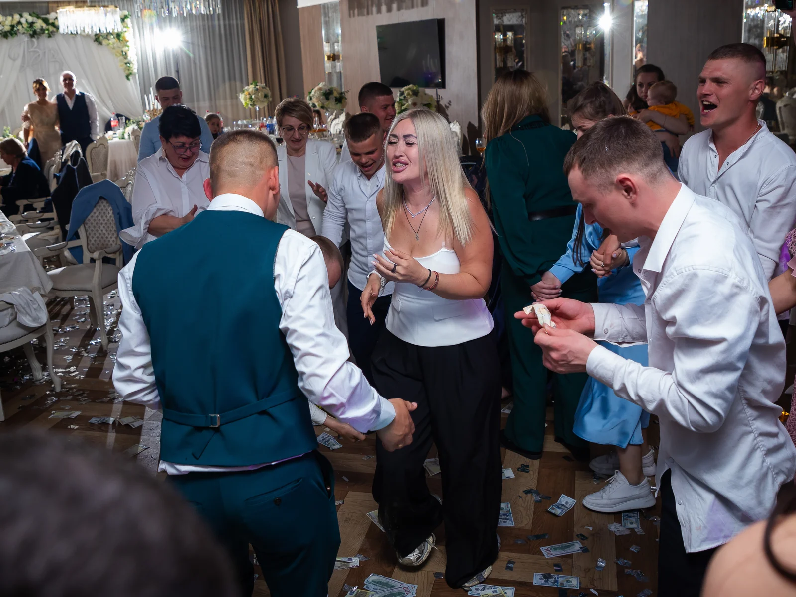 Some are laughing, some tenderly hugging the newlyweds, while others step to the center to give a toast or dance the first dance.
